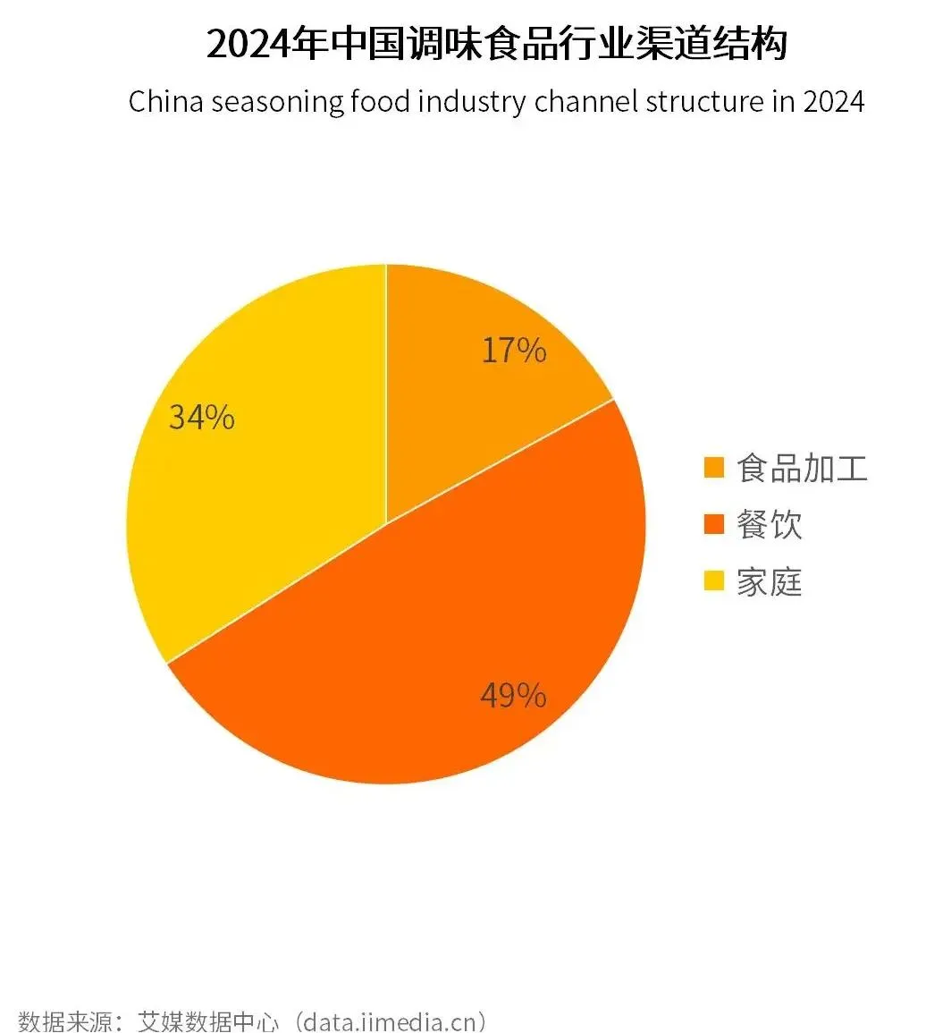 从整体渠道结构看,2024年中国调味品销售主要覆盖餐饮端、家庭端与食品加工端三大渠道,其构成比例分别为49%、34%、17%(艾媒数据中心),如下图所示: