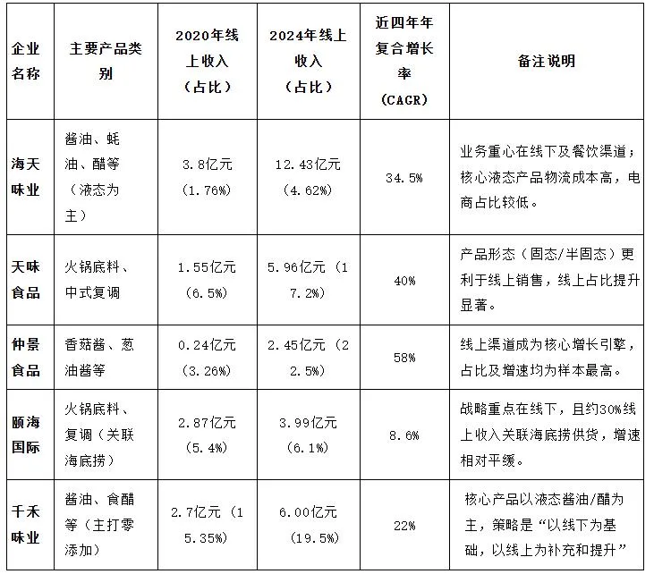 除颐海国际因关联交易及线下战略导致增速平缓外,其余四家企业的线上收入年复合增长率(22%—58%)均显著超越行业整体增速(约13.4%),有力印证了线上渠道已成为调味品企业增长的关键加速器。